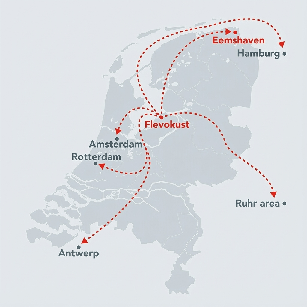 Flevokust logistics hub offers a highly efficient and sustainable alternative to the saturated ARA region. Its strategic position at the crossroads of water, road, and rail provides strong multimodal access to the ports of Amsterdam, Rotterdam, Antwerp and to the Ruhr region.